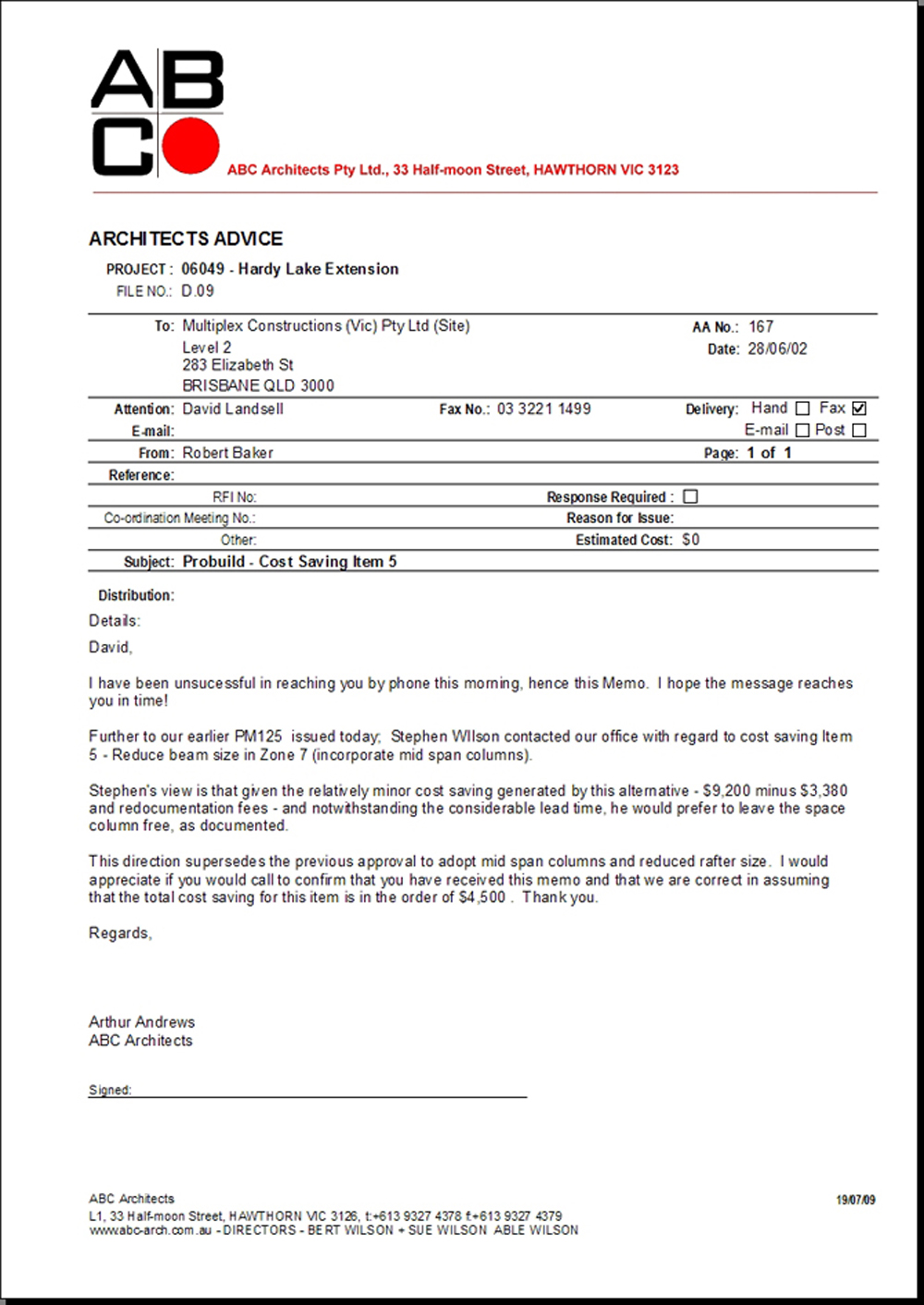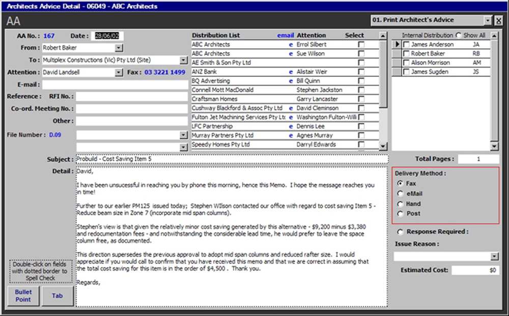 The Architect's Advice module is used specifically in the situation where the firm is are engaged as a design consultant and not as the primary Contract Administrator. It is structured much the same as the Project Memo but with a different name and directed specifically to the builder, rather than the consultant design team. The Architect's Advices can be sent out directly to the recipient list by way of PDF attached to an email drawn from the email addresses maintained in the central database.