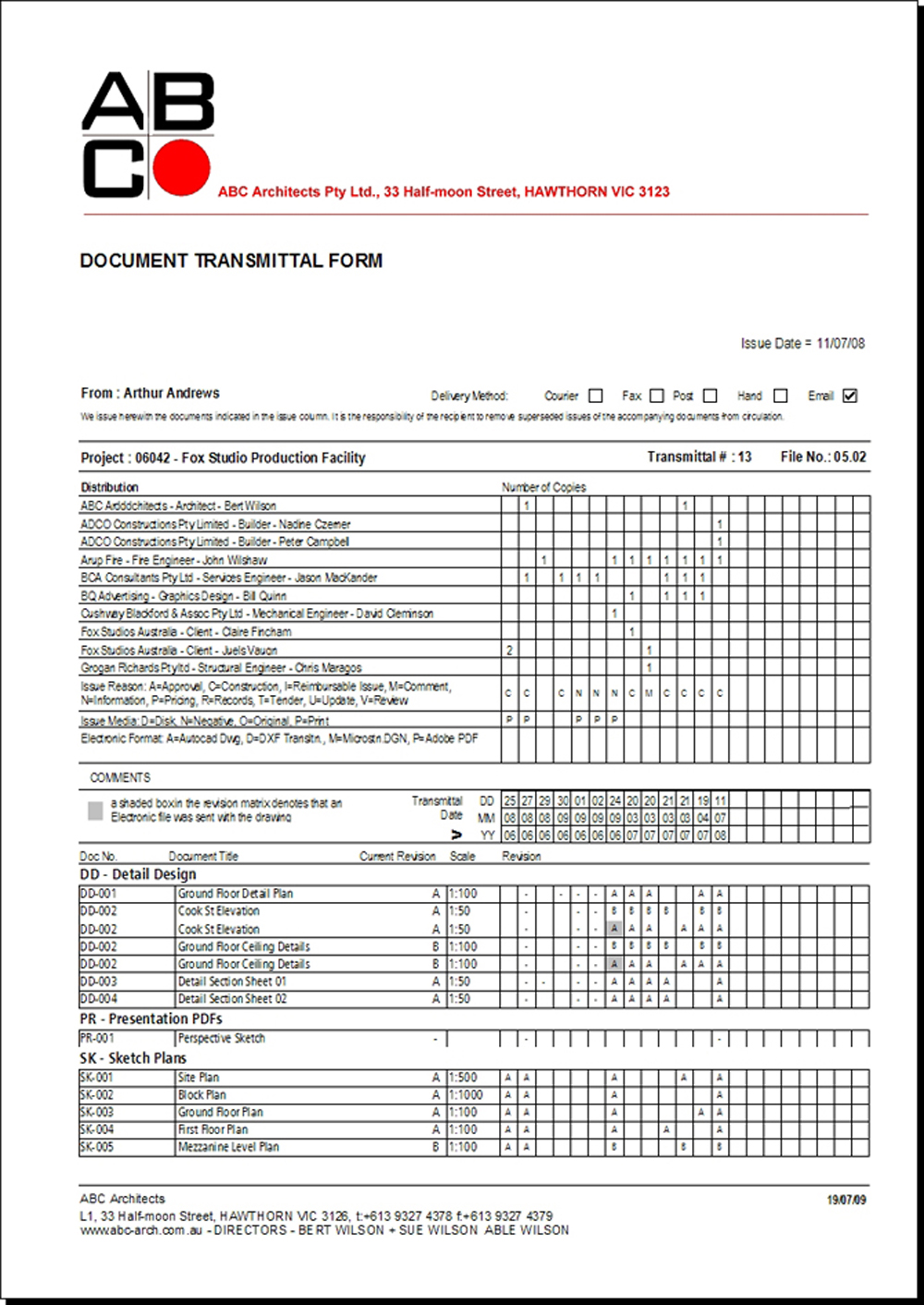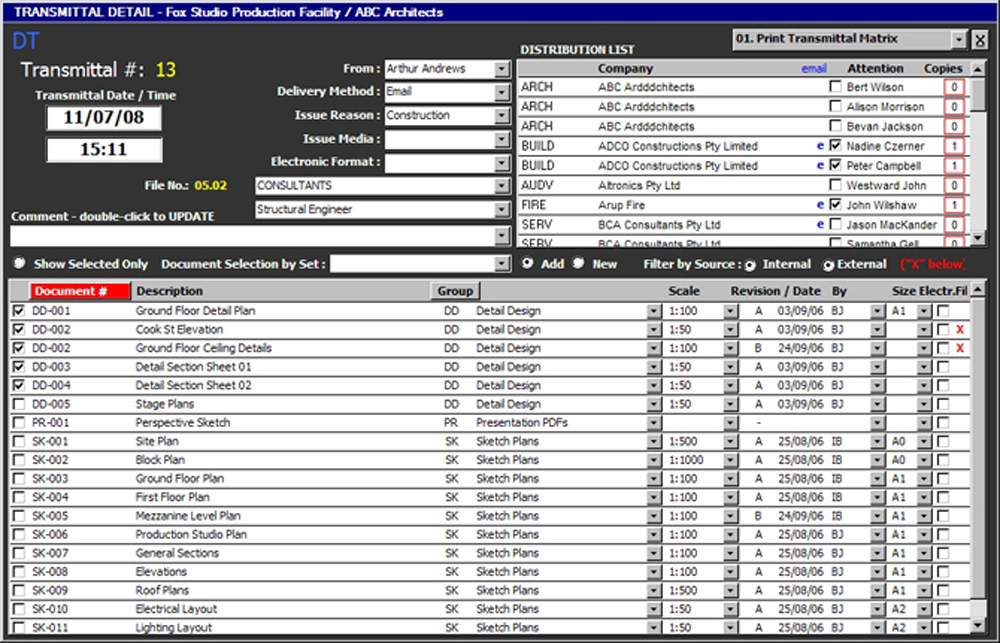 The Document Transmittal module is the means by which the flow of documents out of an office, to consultants, the builder and other involved parties, is controlled. The two primary elements are the Document List and the Distribution List. Main output is by way of the traditional matrix style of Transmittal that shows, historically, who has received what (document and revision) and when. The Transmittal may also be in a simple list form that prevents the recipient from seeing who else has received documents. This is useful in the tender phase of a project. Transmittals may be printed, but can also be generated as a PDF and attached to an email, that will be automatically addressed to recipients, who have email addresses, in your main Organisation Database.
