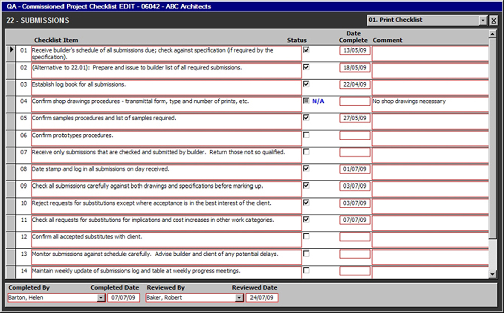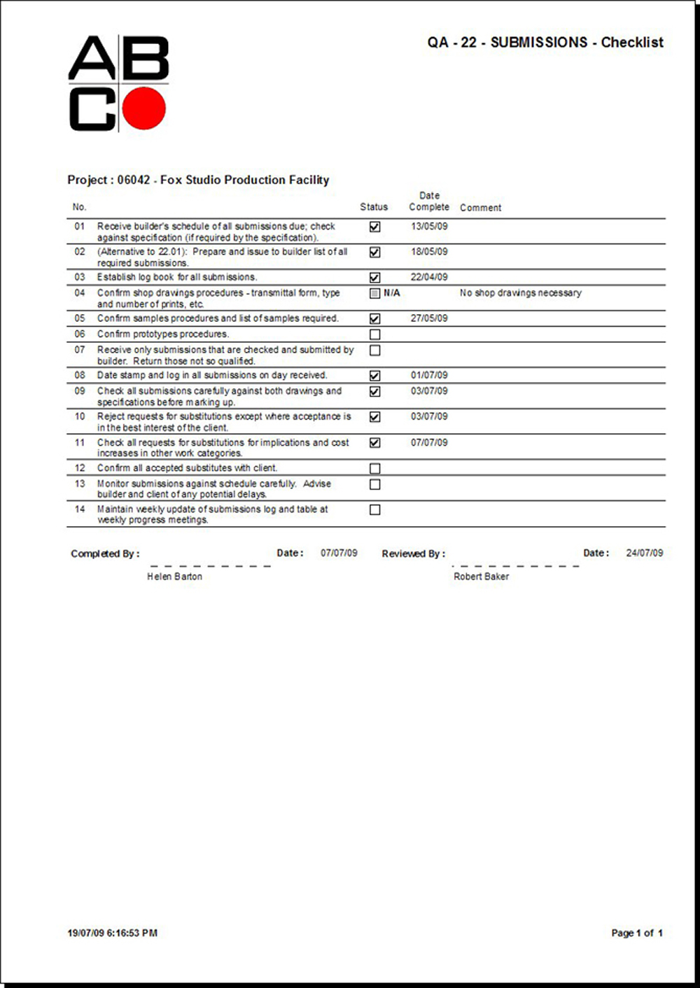 An extensive module for the creation of QA checklists, for each stage of a Project, with fully customisable content that allows modification on a Project by Project basis. All the data for the checklists are stored and maintained within a specific database that facilitates entry, printing, signing and physical storage in Project files, if necessary, yet originating from centralised, system based and standardised data. Rounds off your electronic QA system.